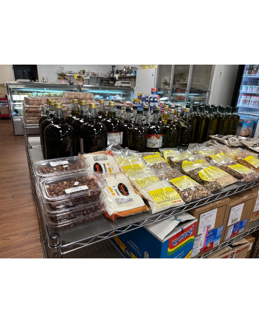 Humus Taza is a family-run Mediterranean market in Egg Harbor Township, located at 6825 Tilton Rd, NJ 08234, right next to Produce Junction. For over 20 years, we’ve stocked authentic oils, spices, pita and breads, sweets, halal snacks, and everyday pantry staples—plus new arrivals weekly.